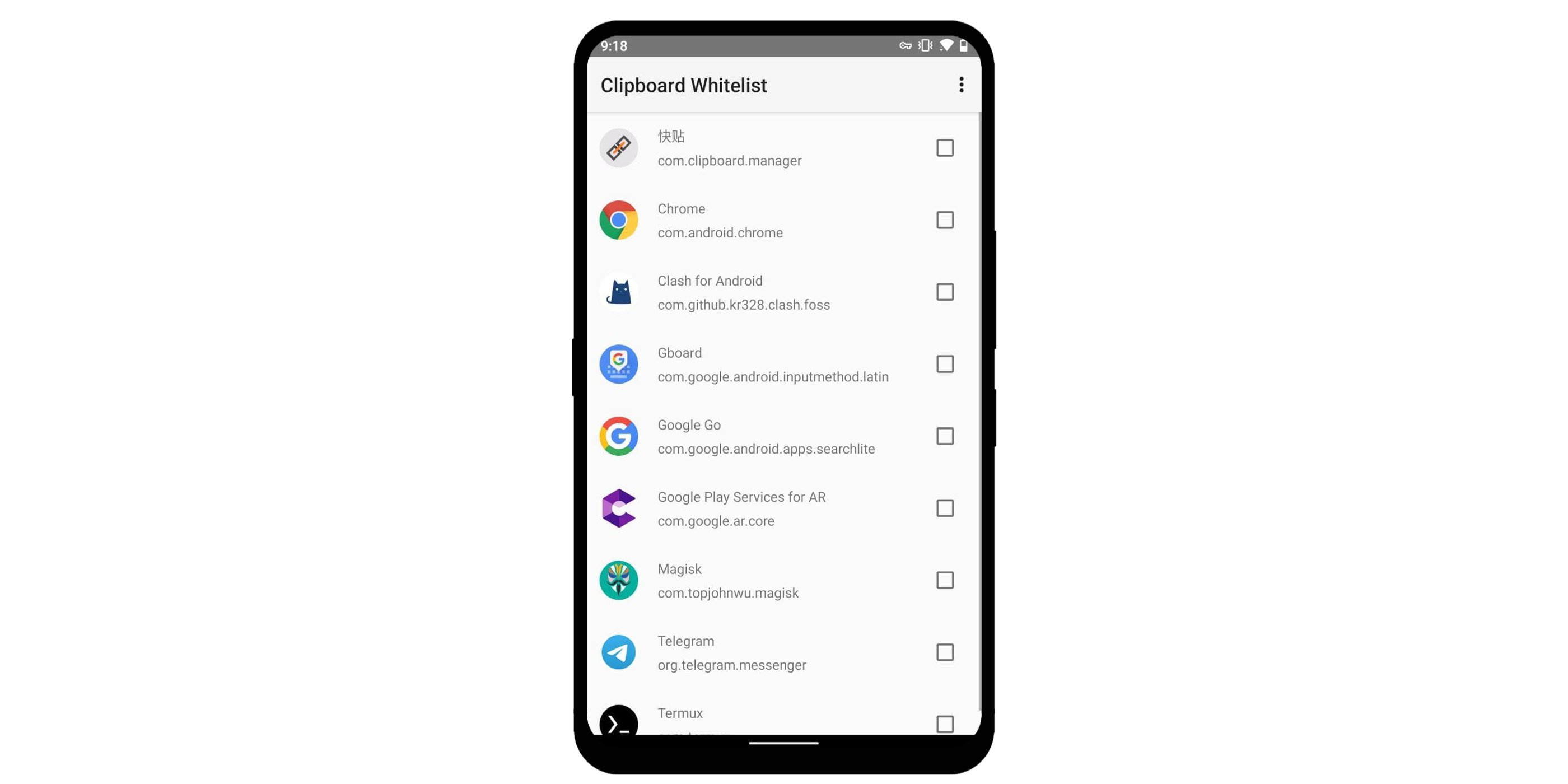 Android 10 之后,应用被禁止在后台读取剪贴板。因此一些旧的应用可能无法正确运行。Clipboard Whitelist 模块安装后,会添加一个名为 Clipboard 的应用。于此应用中勾选相应的程序即可让它们在后台获取读取剪贴板内容。