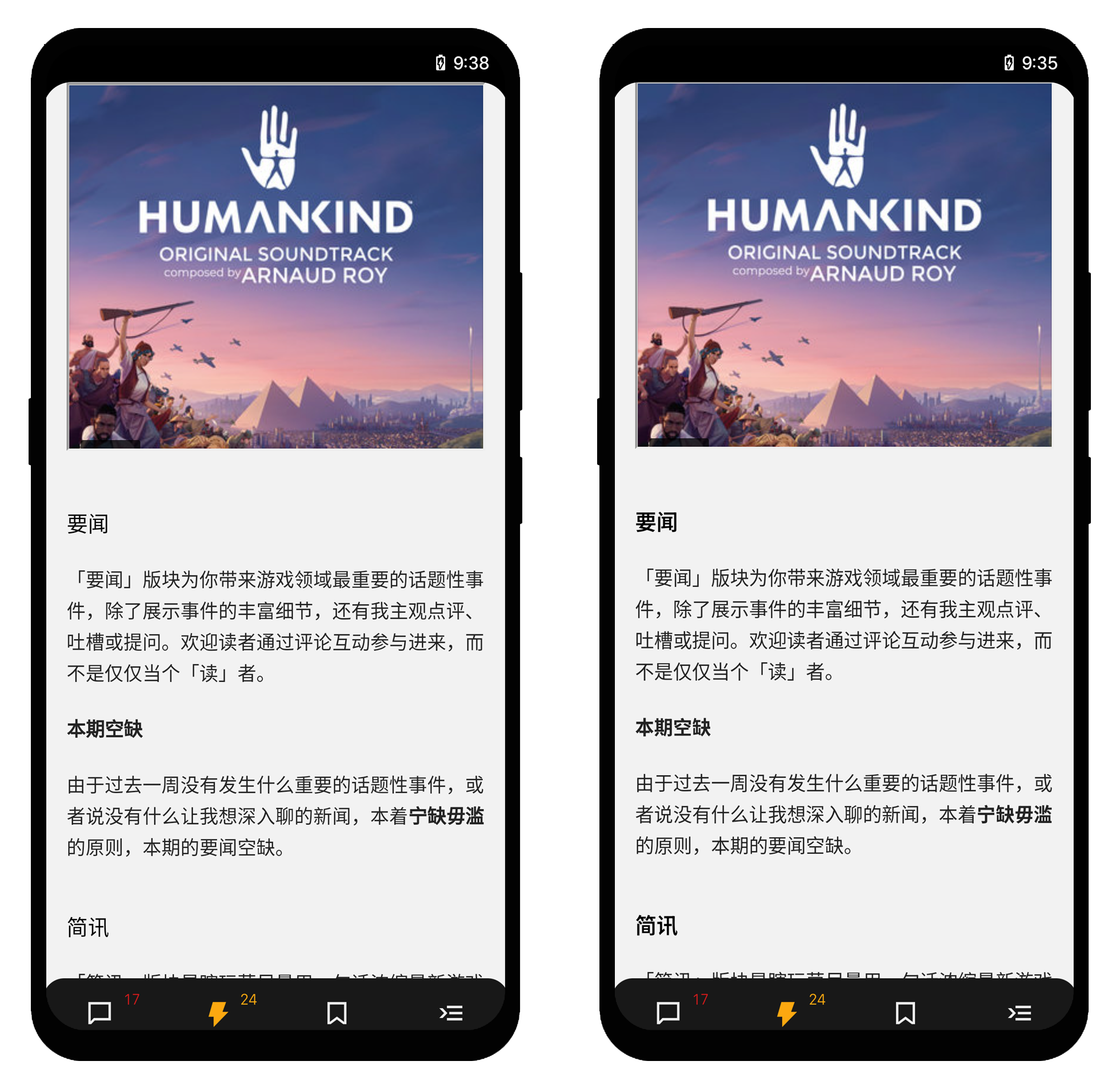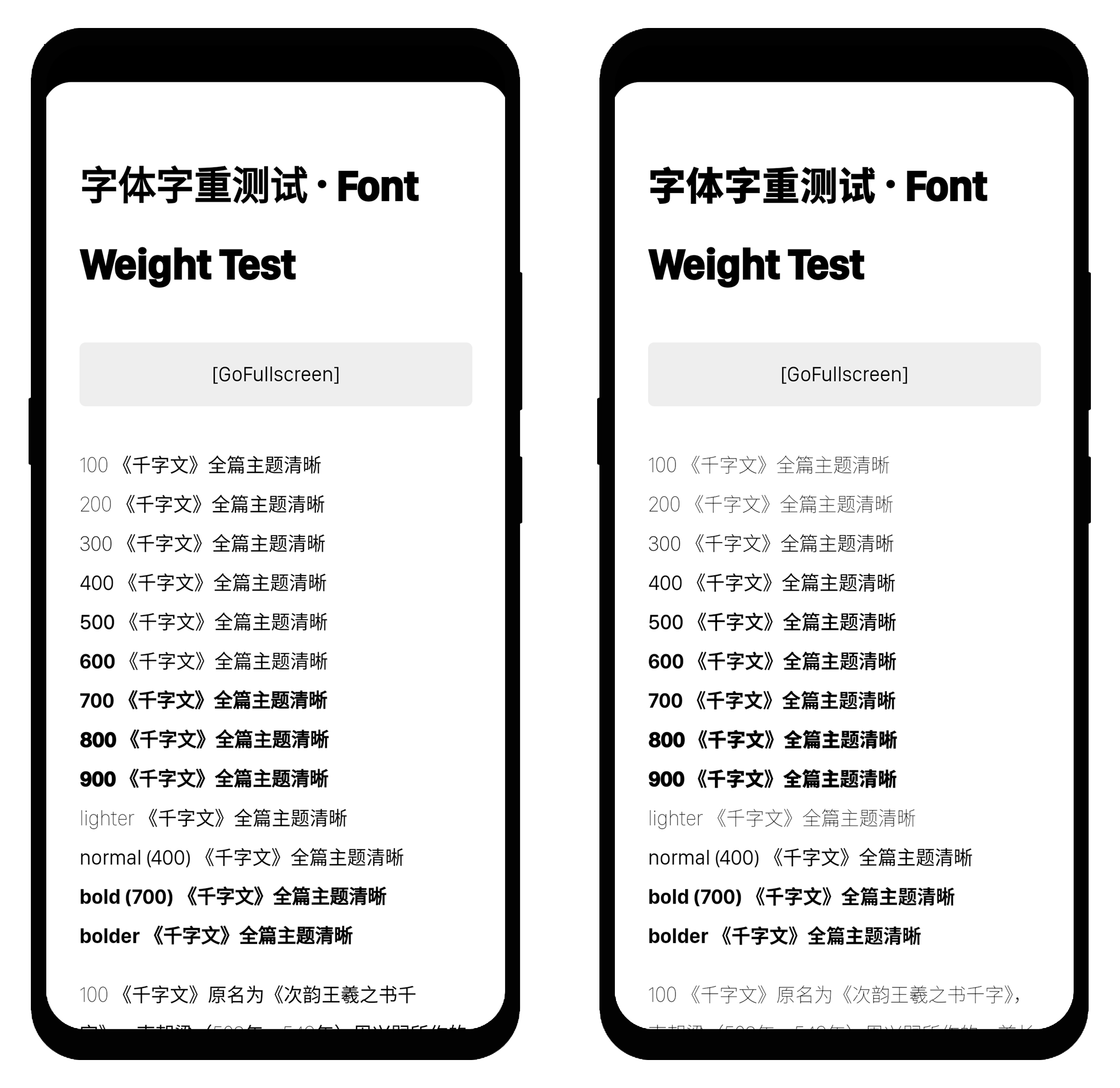 可以看到,右侧的截图中,小标题明显更清晰。这是因为字重决定了字体呈现出的粗细。而在这个页面中,正文字重为 400,「要闻」、「简迅」字重为 600,「本期空缺」、「宁缺毋滥」字重为 700。而我的系统只有400 和 700 两种字重,故这两个小标题只能以 400 的字重呈现,我们便看到了左图那样的效果。NotoCJK 则通过补全缺失的字重,让该粗的字够粗,该细的字够细,使阅读体验好上不少。下面是更详细的对比图,装和不装差距之大肉眼可见: