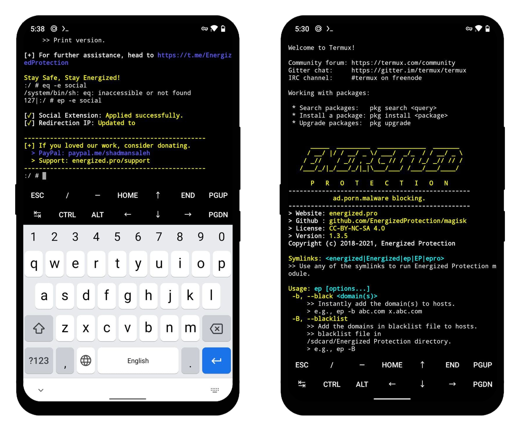 在终端中输入su进入 Root 模式,再使用eq -h便能查看所有支持的命令。比如说ep -ir能用于将某域名定向到某 IP,ep -b example.com 来屏蔽 example.com。模块也内置了一些规则,例如ep -e social可屏蔽社交广告。