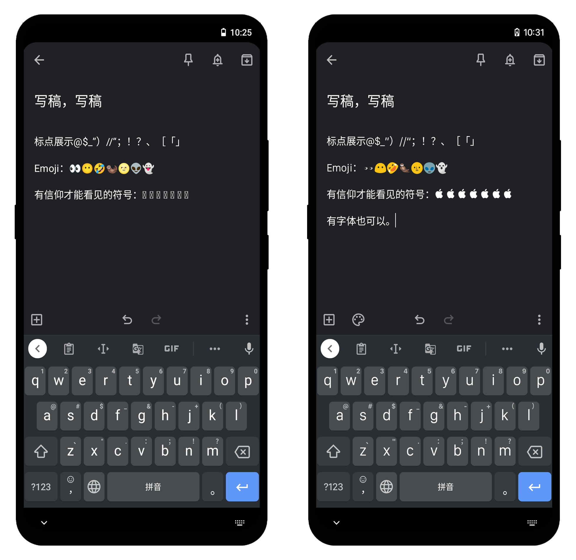 下面是将 Emoji 改成 Blobmoji,字体改为 San Francisco 后同系统默认设置的对比截图,自定义后,你甚至能在 Android 上显示 Apple 独有的字符。