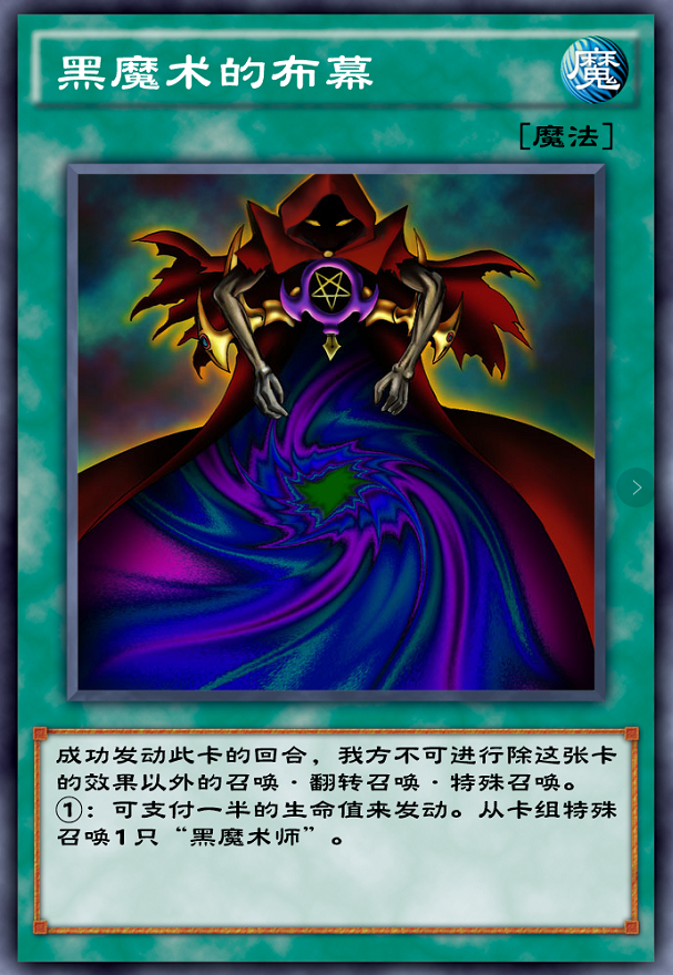 与先手相比后手拥有更多的应对手段以及展开方式其中比较简单粗暴的就是黑魔术的布幕这张魔法卡,通过扣除一半的生命值从卡组特殊召唤一只黑魔术师。因为生命值削减了2000点的缘故使得我们能够发动技能魔术大师来检索与黑魔术师适配的魔法卡,无论是千把刀还是黑·魔·导!都属于非常好用的后手解牌,通过稳定解决场面的难题再搭配其他魔法展开手段很有可能可以一波带走对手。