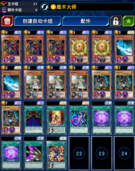 这套黑魔术师构筑主打进攻,没有携带控制器与红坑让整套卡组的节奏变得更加紧凑。因为这套卡组直接满三了最近人气极高的料理队长,所以黑魔术本家大哥也是直接满三保证能够快速拉出大怪。