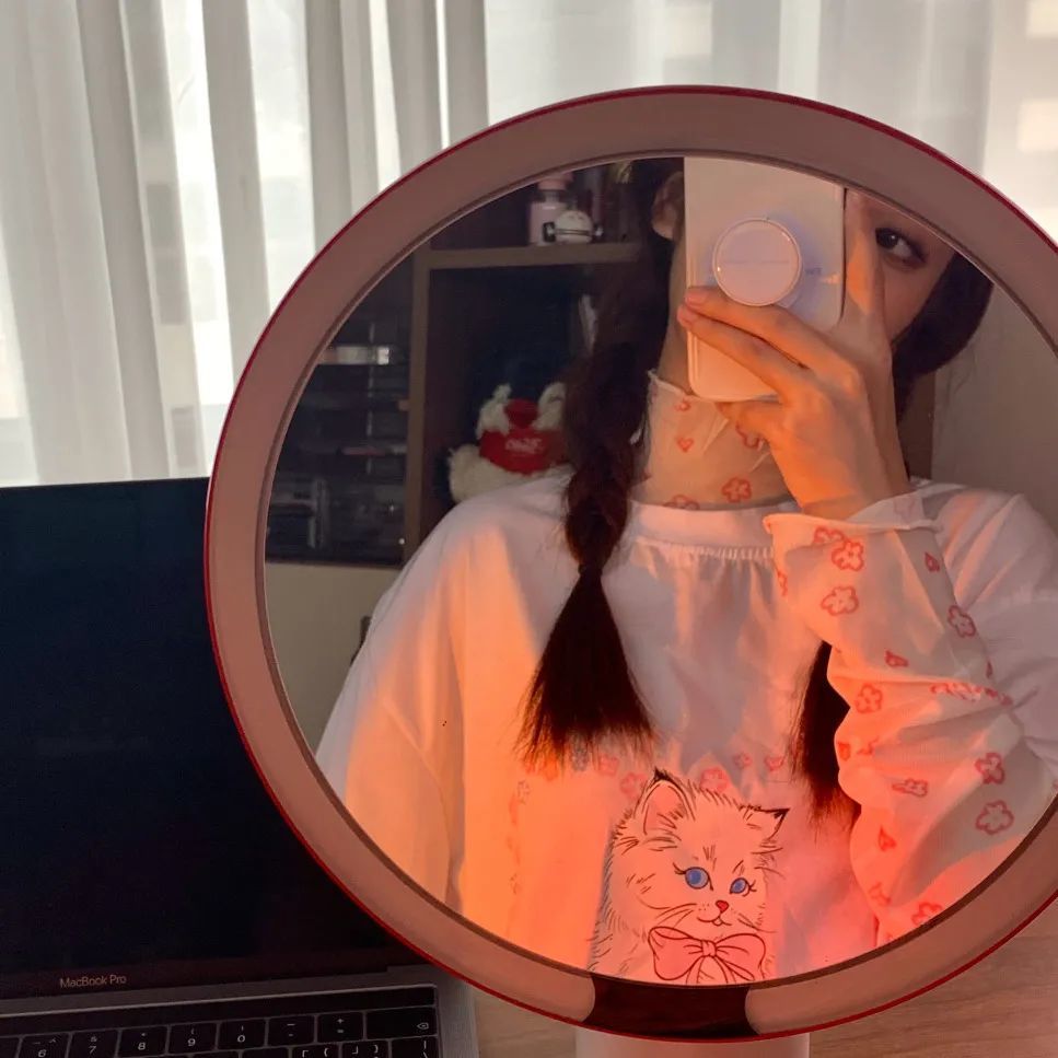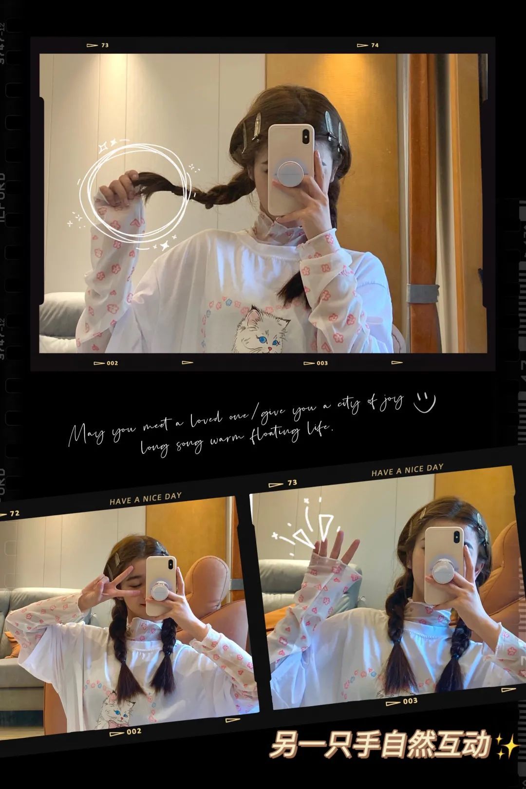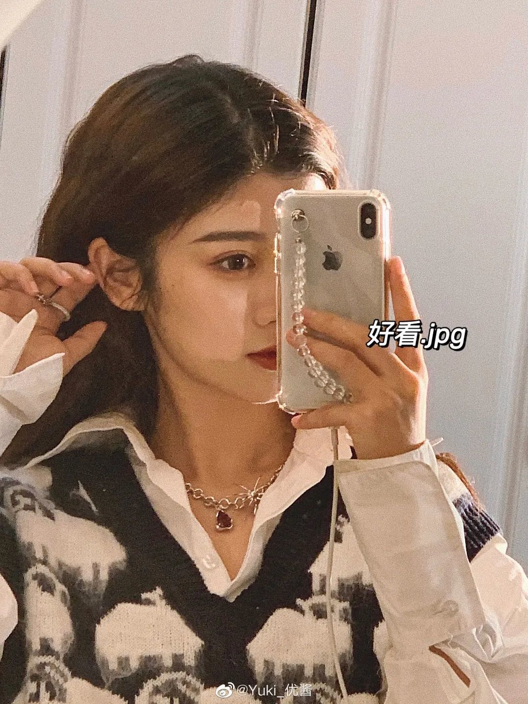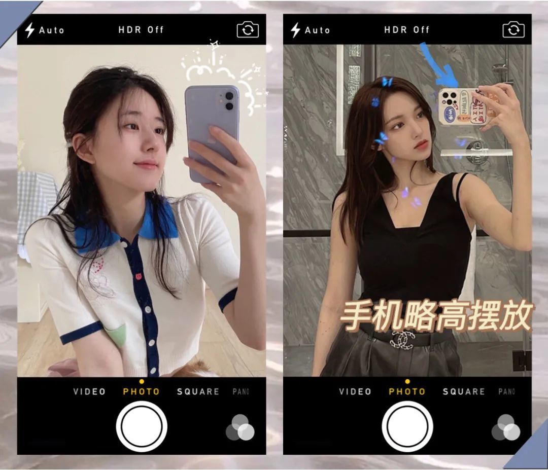 敲重点:手机在镜子里摆放的位置略高于头部(太阳穴附近),俯拍显脸小,这个tips对镜拍也一样适用。