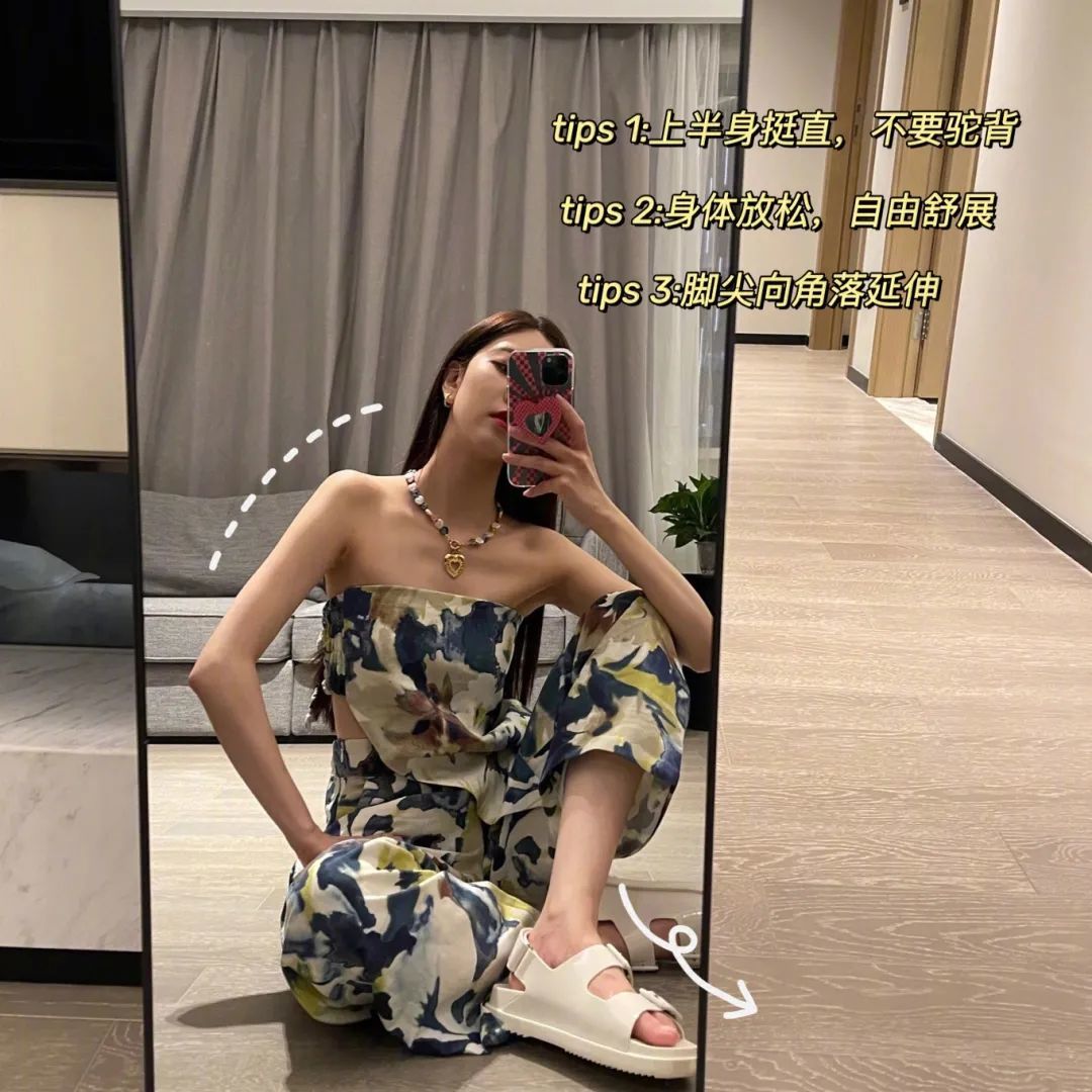 上半身挺直,一只脚平放,另一腿支撑身体,脚尖斜侧着往前放,线条舒展才是重点~