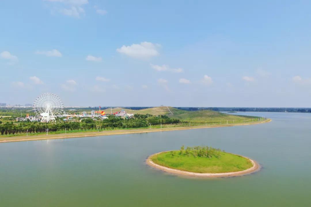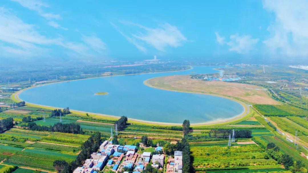 金桂山下的水库在阳光的照耀下显示出初秋的美轮美奂,美景延伸至远方。