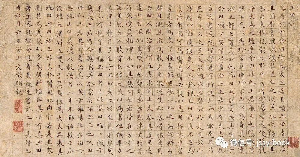 文徵明(原名壁、作璧,字徵明,1470年11月28日-1559年3月28日),号衡山居士,长州(今江苏苏州)人,明代杰出画家、书法家、文学家。其诗、文、书、画无一不精,在画史上与 沈周 、 唐伯虎 、 仇英 合称“ 明四家 ”,在诗文上与 祝允明 、 唐寅 、 徐祯卿 并称“吴中四才子”。传世画作有《千岩竞秀》《 万壑争流 》》,书作有《西苑诗》《渔父辞》等,著有《 甫田集 》。