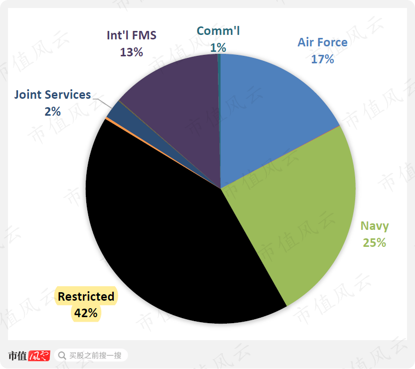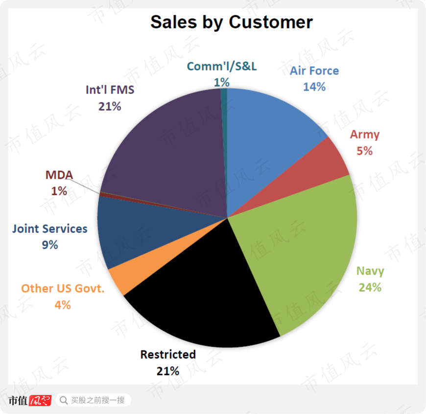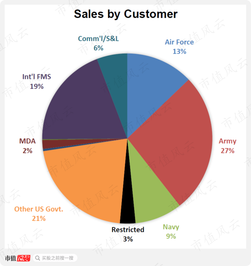 防卫系统的客户透明度就要高得多,比如美国陆军占比27%,空军13%,海军9%,美国其他政府部门21%,而海外军售占19%,保密状态的只有3%。