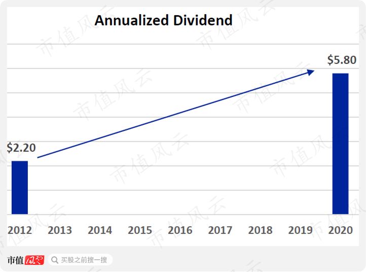 根据公司的披露,年度分红持续增长,在2020年已经达到每股5.8美元。