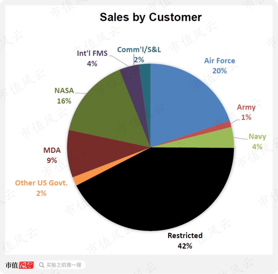 从2020年客户构成来看,这一板块占比达42%的客户信息属于机密,这一比例与前两大客户——美国海军和美国空军的比例之和相当。