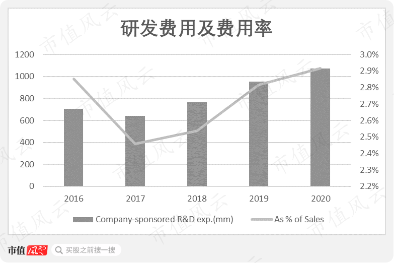 和多数防务公司类似,公司的研发费用并不高,即便到最高的2020年,公司负担的研发费用约11亿美元,研发费用率只有2.9%,最近5年也从未超过3%。