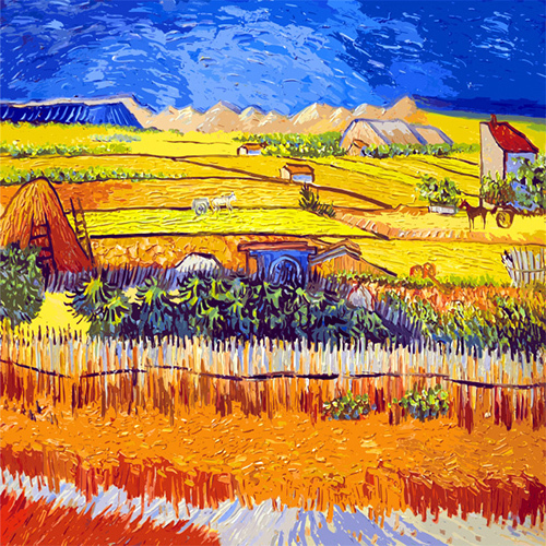 (梵高阿尔的麦田,可以看出已经与印象派明显不同,不讲明暗和光,只突出色彩)