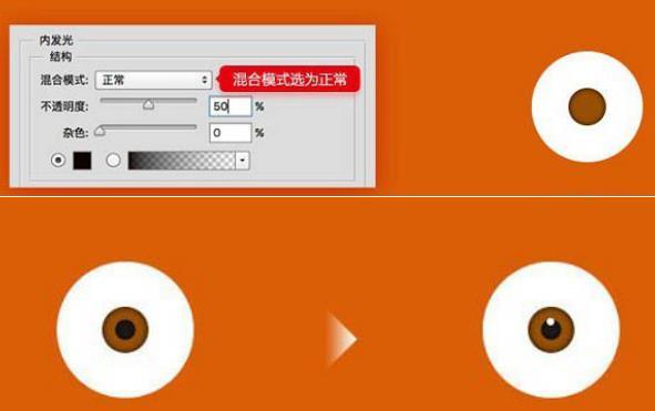 接着是眼睛的制作。椭圆工具绘制出眼睛大小的圆形,接着将其复制并缩小,颜色填充为棕色:#984f03,并且给其一个黑色内发光,眼珠完成后我们需要再一次的复制并缩小圆形并填充黑色作为瞳孔。最后绘制一个白色的小圆作为高光点缀。