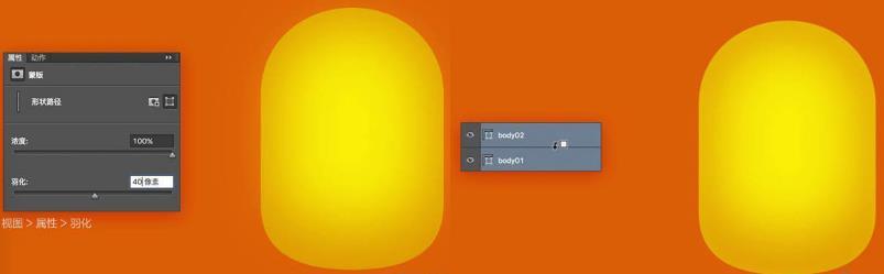 然后我们需要复制出的图形(即身体内部图形)进行羽化。羽化完成后使用剪切蒙版使其嵌套到原始图形上,如图可以看到这不操作约束力羽化范围,可以保证身体边缘的清晰度。