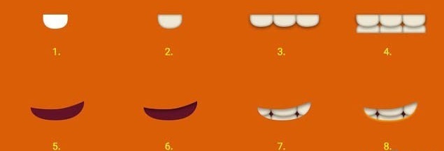 嘴巴绘制。如图先绘制一颗半圆形的牙齿形状并给其一个深灰色的内发光表达牙齿厚度,完成后将牙齿复制三颗进行排列,接着合并添加投影;同样的方法复制得到下排的牙齿。