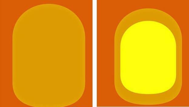 身体形状出来后双击此图层,并填充颜色为:#de9904(左图)。紧接着我们需要复制身体图形并缩小置于图形内部,将颜色设置为:#ffff08(右图)。