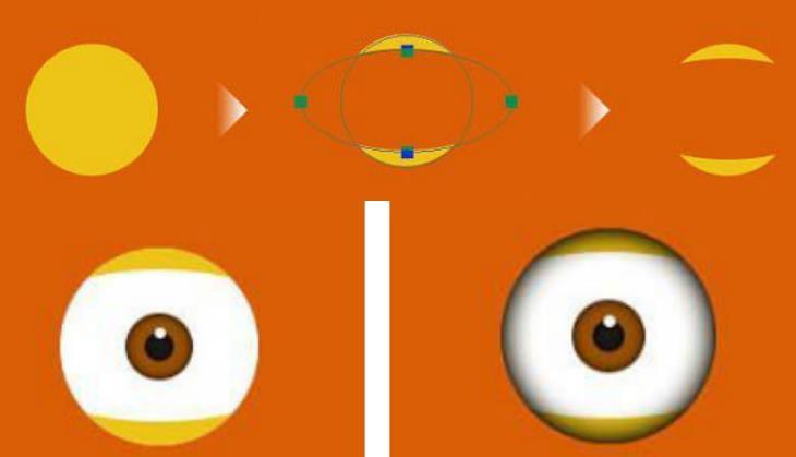 眼皮的制作需要复制眼睛圆形并填充为黄色:#eec317,接着再画一个椭圆与其相切即可得到。完成后将刚刚操作的所有眼睛涂层合并,并且需要给合并好的图层一个黑色的内发光。