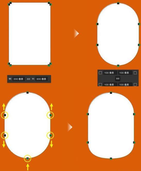 新建PS文档,创建一个200 * 300的圆角矩形且圆角值设为最大,得到一个胶囊状图形。接着我们使用“直接选择”工具,选中如图所示五个点,并按照图示箭头方向调整图形形状。如此就得到了“小黄人”的身体形状。