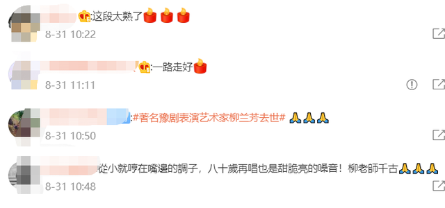 得知这个消息的网友也表示十分悲痛,都跑来评论区留言。有网友说从小就在嘴边哼的调子,八十岁再唱也是甜脆清亮的嗓音,刘老师千古。更多的网友则是希望柳兰芳老师一路走好,也表达了对柳兰芳老师深深的不舍。