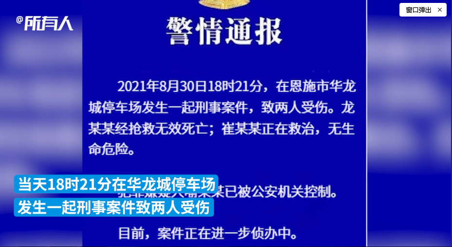8月31日,湖北恩施。警方通报“知名企业家被股东驾车撞伤致死”事件:系一起刑事案件。龙某某经抢救无效死亡,崔某某无生命危险。犯罪嫌疑人已被公安机关控制。