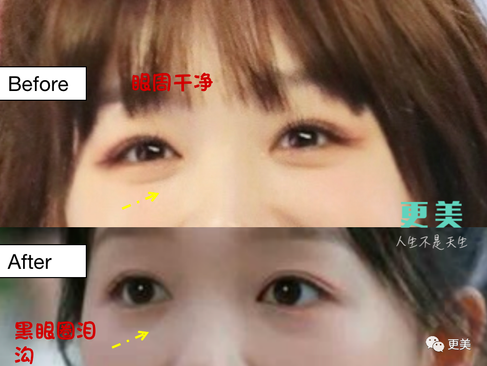 没有了“卧蚕妆”和带动卧蚕的动作后,泪沟黑黑眼圈会加深疲惫感。
