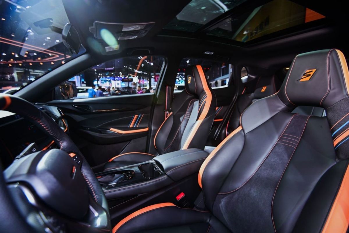 而在侧面,依旧是采用了动感十足的腰线设计,同时也融入了橙色饰条做装饰,配上亮黑色的双五幅式大尺寸轮毂,进一步增加了整车的运动感。
