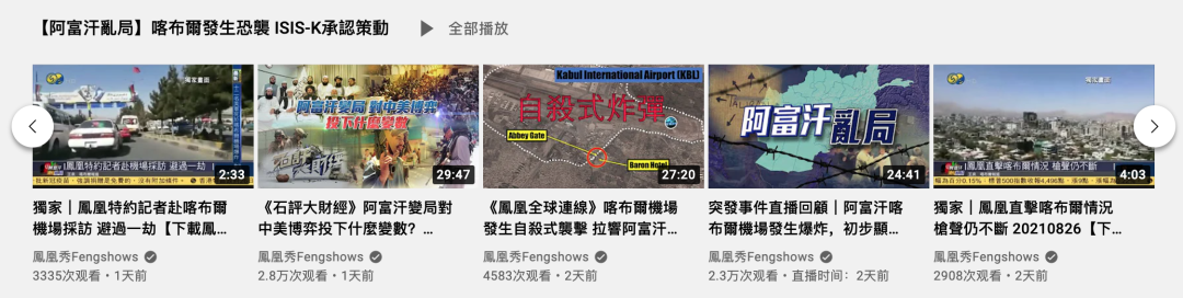 凤凰卫视各台全端迅速响应,8月16日起推出四期《阿富汗乱局》特别节目,驻美、英、俄、澳、巴基斯坦、伊朗等多地记者带来各地最新表态,而香港现场的评论员也为观众做出最新局势分析与解读。