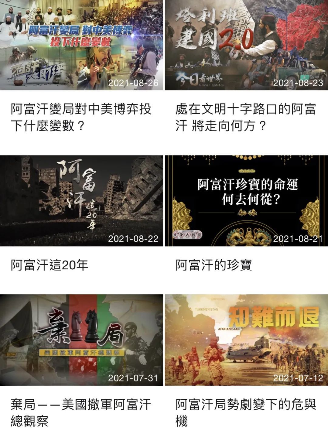 从当前局势解读到背后原因探析,从事态进程追踪到历史背景溯源,从军事战争研究到经济民生探讨,从地缘政治、国际战略到宗教矛盾、文化变革,凤凰卫视制作《皇牌大放送》《石评大财经》《大新闻大历史》《今日看世界》《时事亮亮点》《一虎一席谈》《周末龙门阵》《宝岛聚焦》《台湾一周重点》《文化大观园》《全媒体大开讲》《新闻今日谈》《凤凰全球连线》《凤凰焦点关注》《有报天天读》《总编辑时间》《时事大破解》等多档专题节目及纪录片,多角度、深层次剖析了阿富汗的前世今生,将饱经战火摧残的阿富汗展示在世人面前,也将几十年来在这片土地上发生的大国角力向所有人讲述。