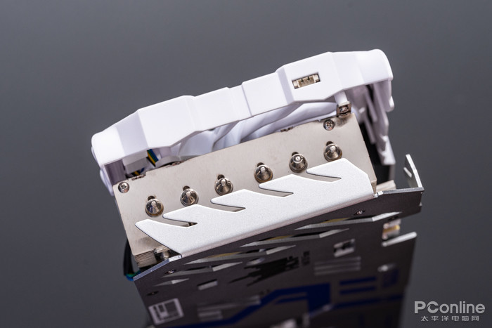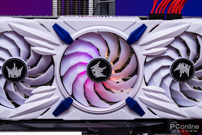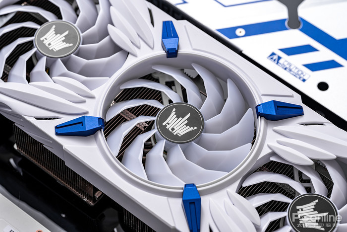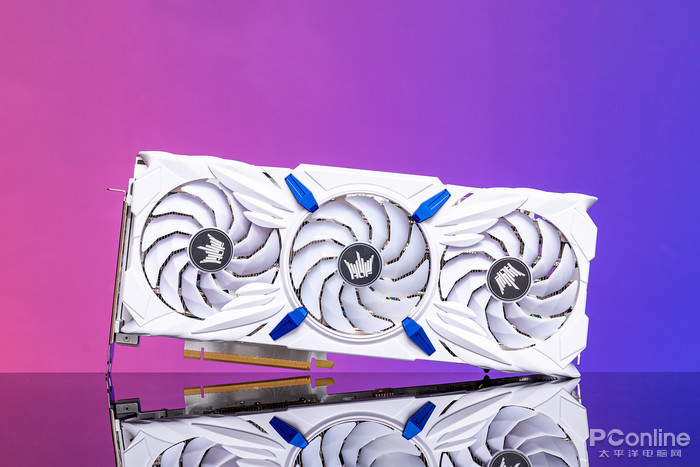 显卡外观运用了天使羽翼的设计理念,中间风扇延展出两对雪白的天使羽翼,羽翼还进行了立体效果处理,具有“一展高飞”的力量感,旁边点缀了四个蓝色装饰块,有点天使高达的感觉了。