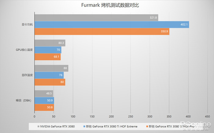 在核心功耗方面,影驰 GeForce RTX 3080 Ti HOF Pro为350W,RTX 3080公版为320W,而HOF Extreme为400W。