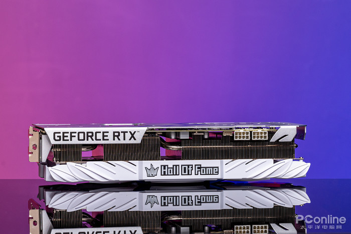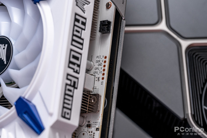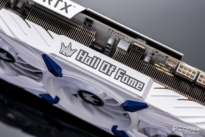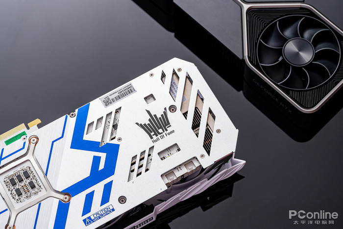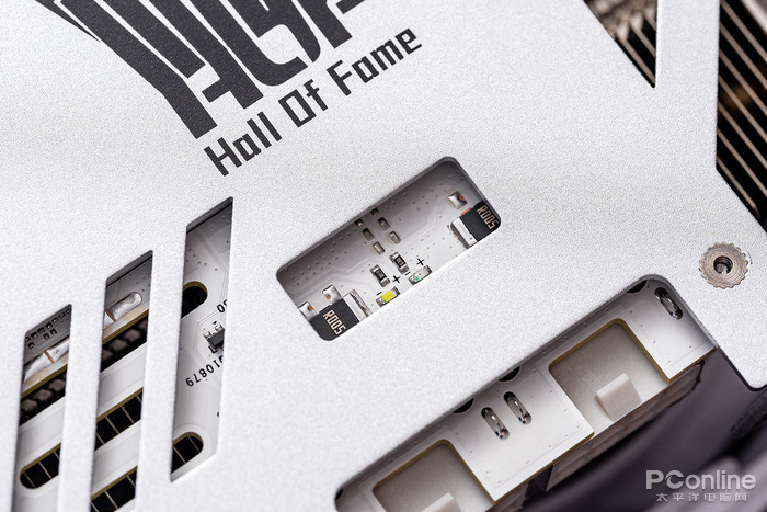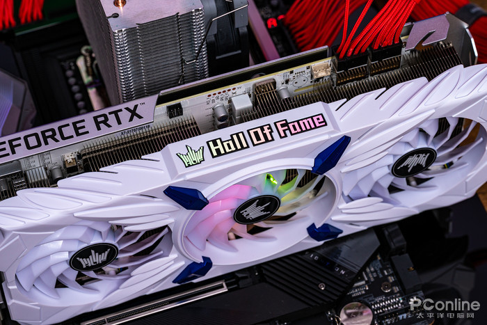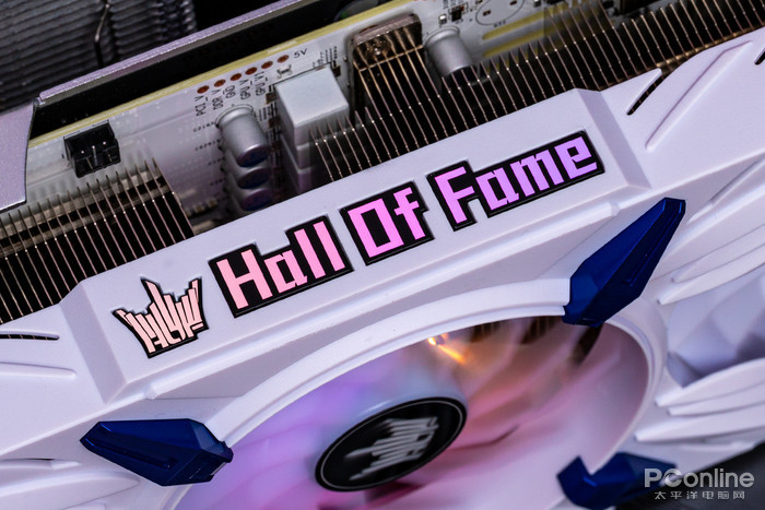 天使羽翼的设计线条贯穿显卡马甲侧面,中间的名人堂“Hall Of Fame”logo支持RGB灯效。