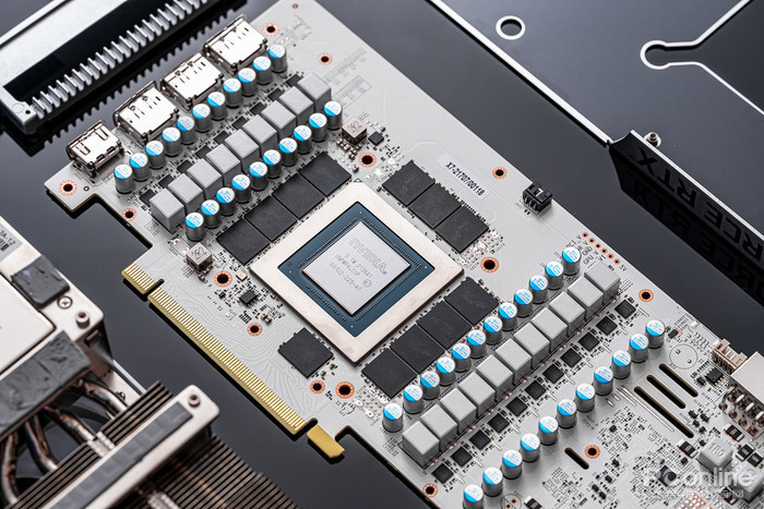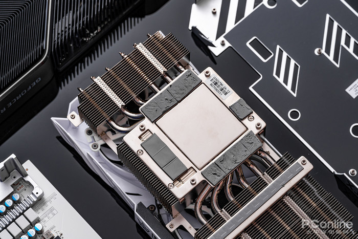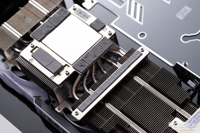 GPU核心散热采用镜面铜底方案,并采用镀镍工艺处理,增强耐用性,铜底表面光亮平整,有利于充分贴合核心,高效导出热量,这一代GDDR6X显存发热量较大,因此在周围显存位置均配备了导热硅脂,保障显存稳定运行。