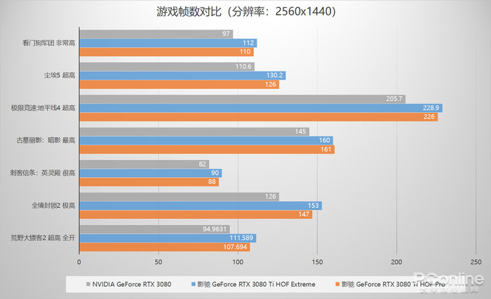 可以看到,影驰 GeForce RTX 3080 Ti HOF Pro在2K分辨率下的游戏帧数基本都能跑到100帧以上,相比RTX 3080公版帧数领先幅度在7.32%至13.92%之间。