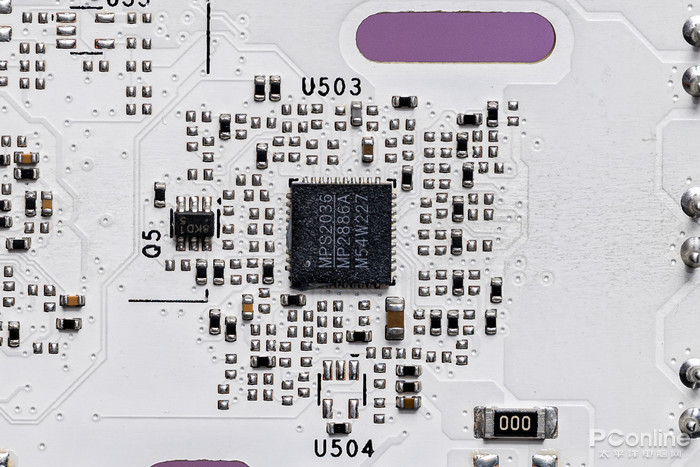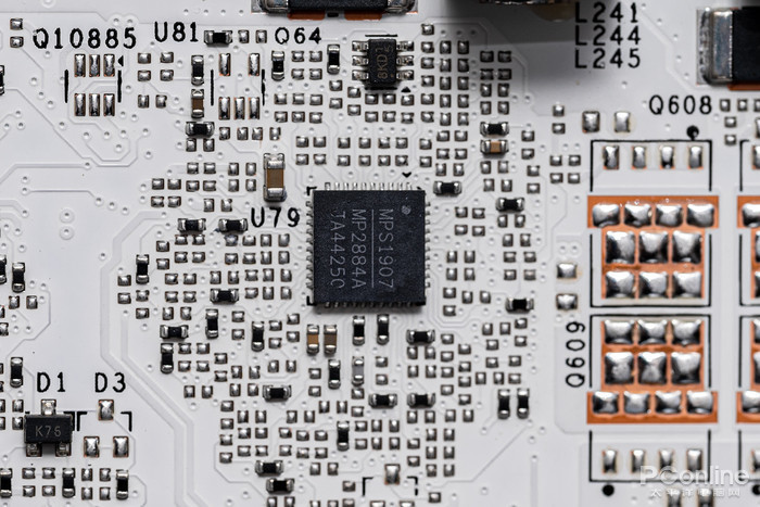 显卡的16+4相供电采用电容+DrMos+全封闭电感的组合,每相核心和显存供电均配备了来自美国芯源电子的DrMos,型号为MP86990,2020年第39周生产,据查询,该DrMos支持的输入电压为3-16V,最高可输出50A的电流。