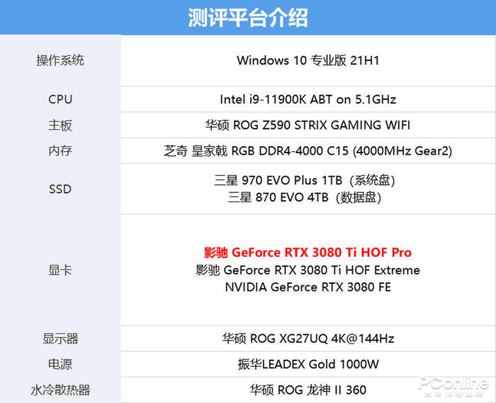 这次测评采用了市面上较为高端的主机平台进行测试,为了比较一下HOF Pro和HOF Extreme的性能区别,笔者加入了RTX 3080公版和影驰 GeForce RTX 3080 Ti HOF Extreme进行对比。