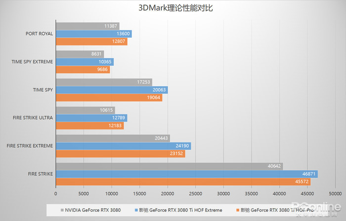 可以看到,虽然RTX 3080 FE同是采用Ampere架构,但是影驰 GeForce RTX 3080 Ti HOF Pro在核心规模上享有优势,所以反应到理论性能时,影驰 GeForce RTX 3080 Ti HOF Pro平均能够拥有12.56%的领先幅度,在越高分辨率下,差距会逐渐拉大。