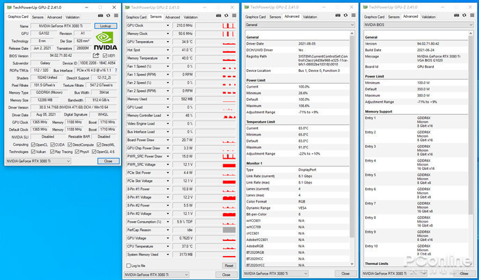 首先来看显卡的GPU-Z信息,影驰 GeForce RTX 3080 Ti HOF Pro的显卡默认功耗墙为350W,最高功耗墙为380W,在待机状态下显卡的温度为34.9度,处于合理范围中,风扇智能启停已生效。