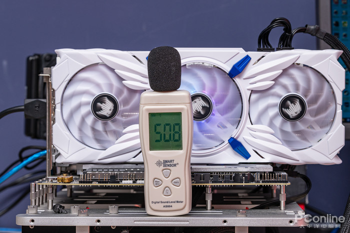 接下来对显卡进行温度噪音对比,我们在温度25度、环境噪音值为35.2 dBA的小房间内,采用开放式平台统一进行温度和噪音测试。