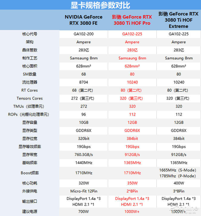 首先放上显卡的规格参数对比,影驰 GeForce RTX 3080 Ti HOF Pro的核心Boost频率为1710Mhz,相比公版高45Mhz,比性能模式下的HOF Extreme频率略低,与RTX 3080公版的Boost频率一致,但是在流处理器规格上则比RTX 3080提升了17.7%。