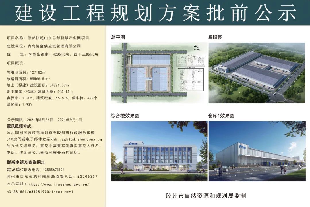日前,大件快递龙头德邦物流山东总部建设迎来重大进展,青岛胶州市自然资源和规划局发布了德邦快递山东总部智慧产业园项目批前公示。