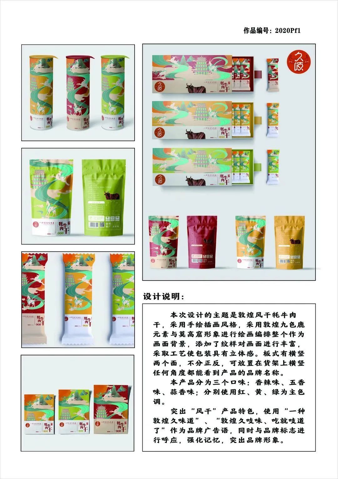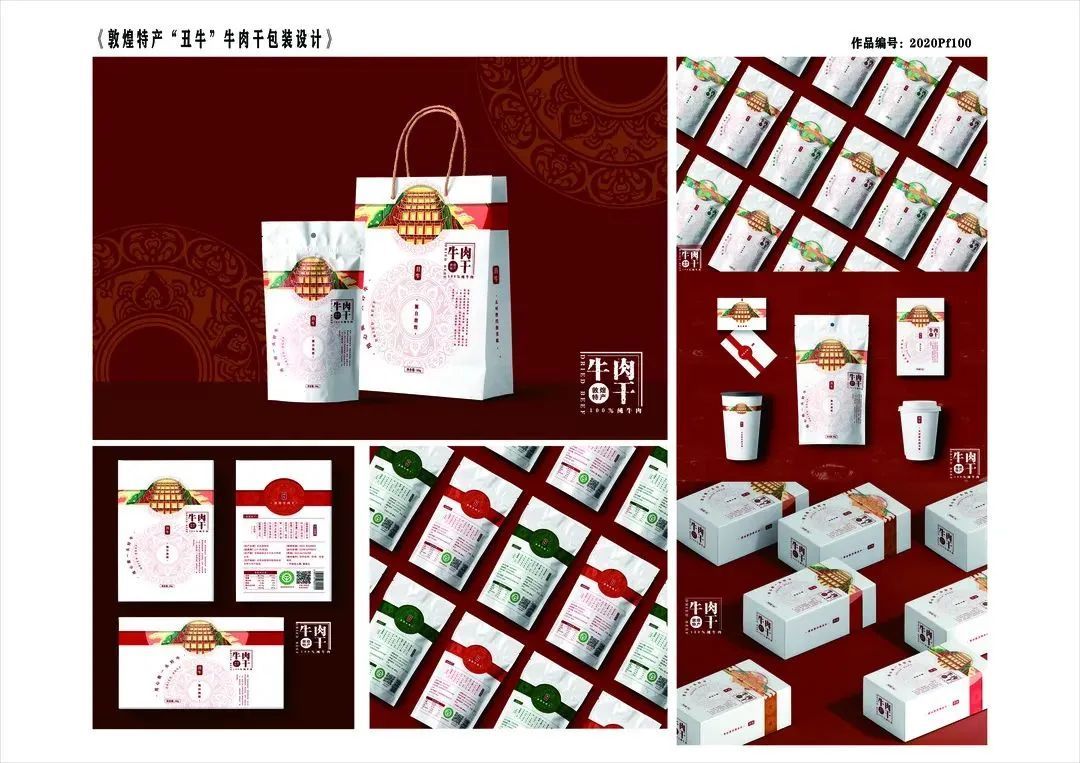通过对敦煌文化进一步了解后,选择自己感兴趣的方向进行创意设计,包装特色创意使用牛形开窗,整体横竖排版,便于角度货架摆放,生动形象结合敦煌特色,整体画面丰富,让敦煌特色牦牛肉干包装赋有青春感,年轻化。符合现代人审美追求。