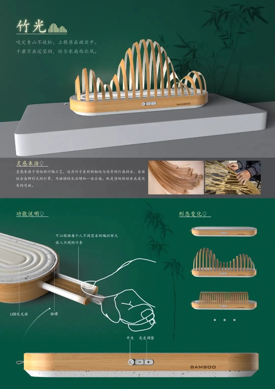 灵感来源于传统的竹编工艺,运用竹子良好的韧性与现有的灯具结合,自由组合各种形式的灯罩,为枯燥的生活增加一丝乐趣。既是传统的继承也是现有的突破。