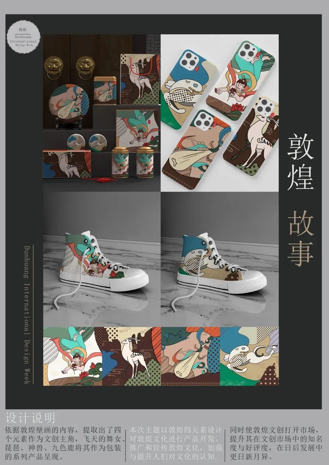 本次主题以敦煌四元素设计对敦煌文化进行产品开发。推广和宣传敦煌文化,加强与提升人们对文化的认识。选用敦煌壁画的配色,画面里大胆的“圆点”艺术、线条与飞天舞女、琵琶、神兽、九色鹿四大主体物,辅助元素传统图案祥云纹,飞舞的飘带设计,展现出国潮风与现代艺术的结合。