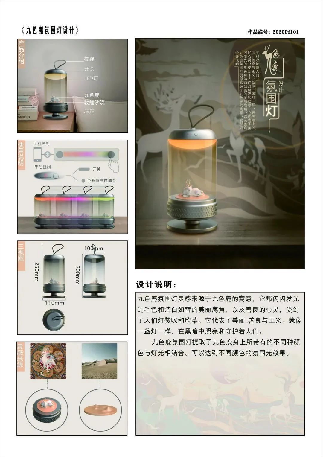 《梦鹿》氛围小夜灯以敦煌九色鹿作为主要设计元素,利用导光板的导光特性,将灯具与鱼缸、花瓶、香薰与蓝牙音箱的功能相结合,设计出这款可随心情变换使用功能的治愈系小夜灯,九色鹿在敦煌莫高窟的洞窟壁画中是经典之作,也是敦煌莫高窟最优美的壁画之一。将九色鹿的元素运用在具有现代功能的灯具产品中,以这种参与现代人生活方式的形式来传承中国古代神话传说与敦煌壁画传递出的美是此款产品的设计初心与思路。