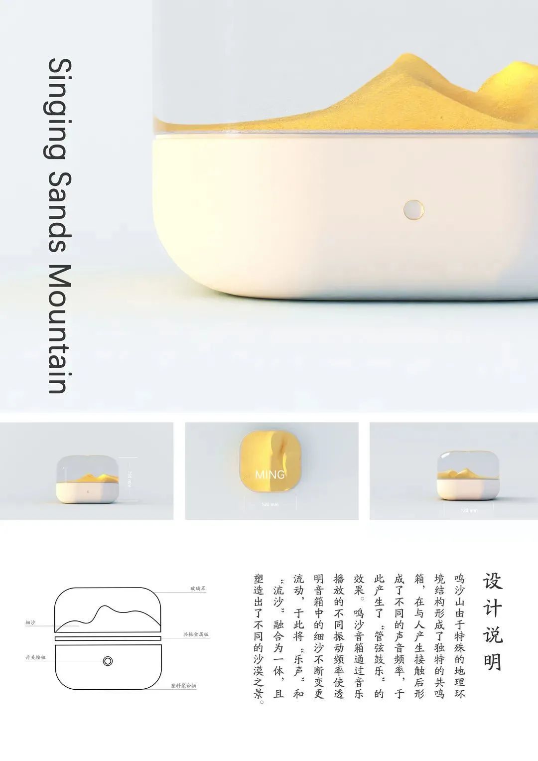 从鸣沙山本身的独特性切入思考,通过利用共振音箱和金属板的振动改变“鸣沙音箱”中流沙的形态,使之与鸣沙山的“管弦鼓乐”效果相呼应,同时由于每首歌曲的振动频率不同,鸣沙音箱会逐渐形成不一样的沙漠景色,与鸣沙山本身“年年相异”的大漠景象相应。希望人们可以在流淌的细沙和乐声之中度过美好而闲适的时光。