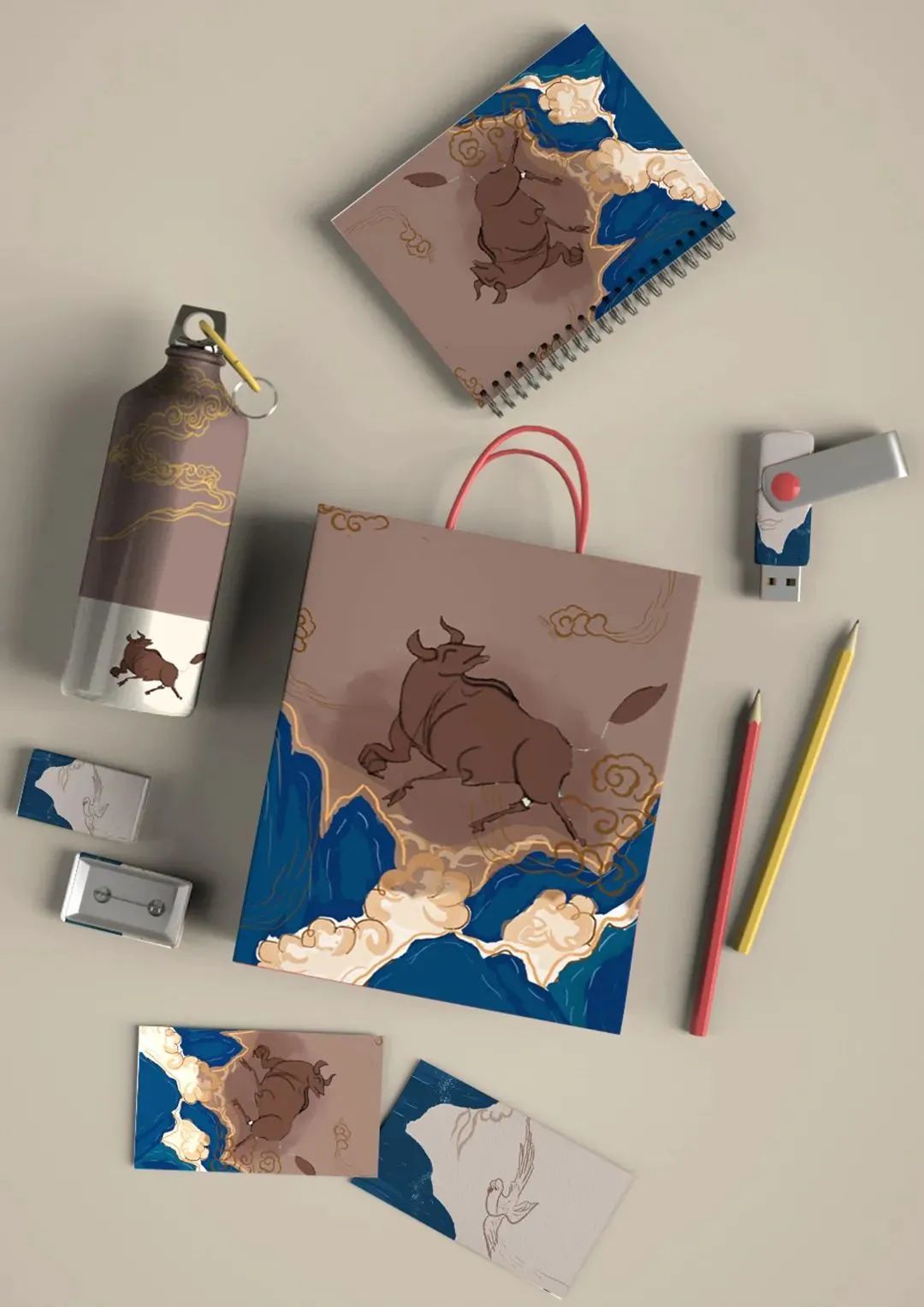 取材敦煌壁画的牛和飞鸟的形象,并结合祥云、青山等结合进行插画设计。