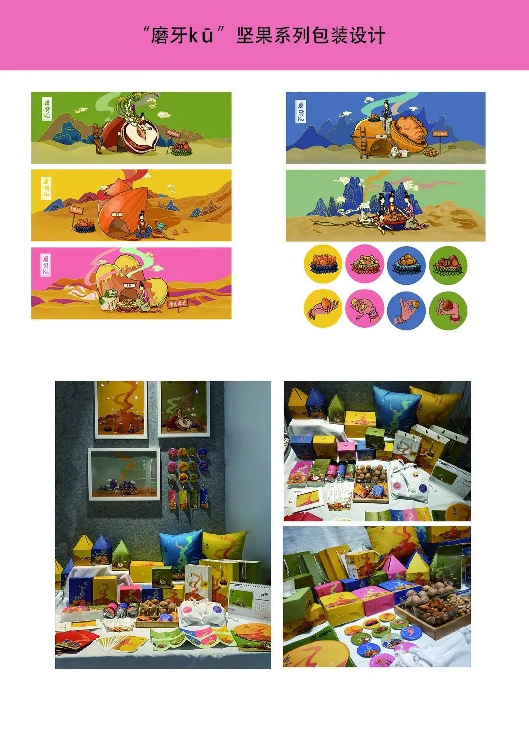 作为新时代的设计者,作为当代设计师和广告的践行者,我们理应继承和发扬我国的优秀传统民族文化。不盲目的追求国外的包装设计形式,应更加注重自己产品的品位与内涵,将民族风格的色彩、地域性特征运用于包装中。将敦煌民族元素运用于包装设计中,设计名为“磨牙kū”的坚果包装,制作现代创意插画与敦煌故事结合的包装产品;运用扁平插画来表现,探寻敦煌文化与特产在包装设计上的碰撞。