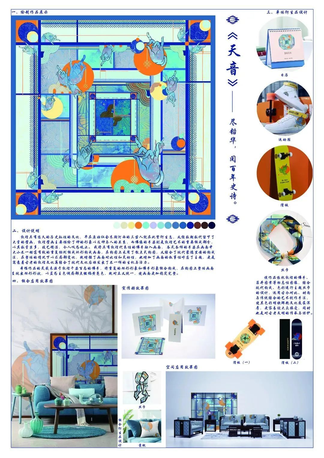 该作品依托敦煌的佛手、藻井图案等标志性图像,结合现代构成、色彩进行主题丝巾的设计,运用古今对比、时尚与传统结合的艺术创作手法,使其色彩明快鲜艳文化底蕴深厚,更容易被大众接受,同时也是对古老文明的传承与保护。