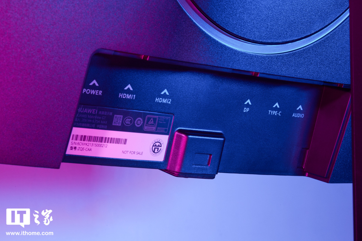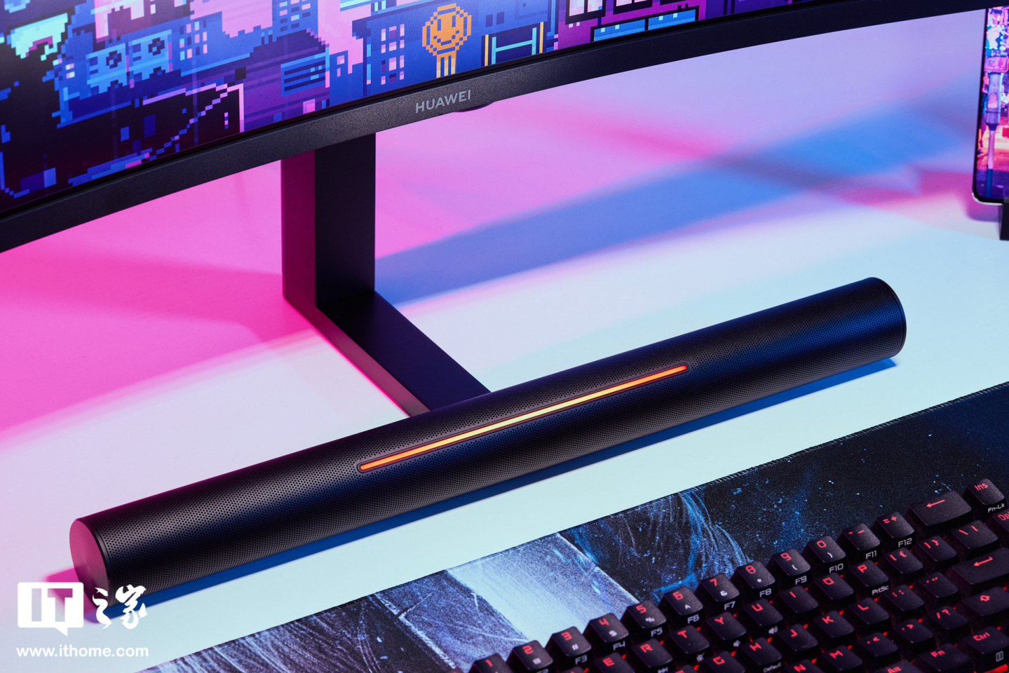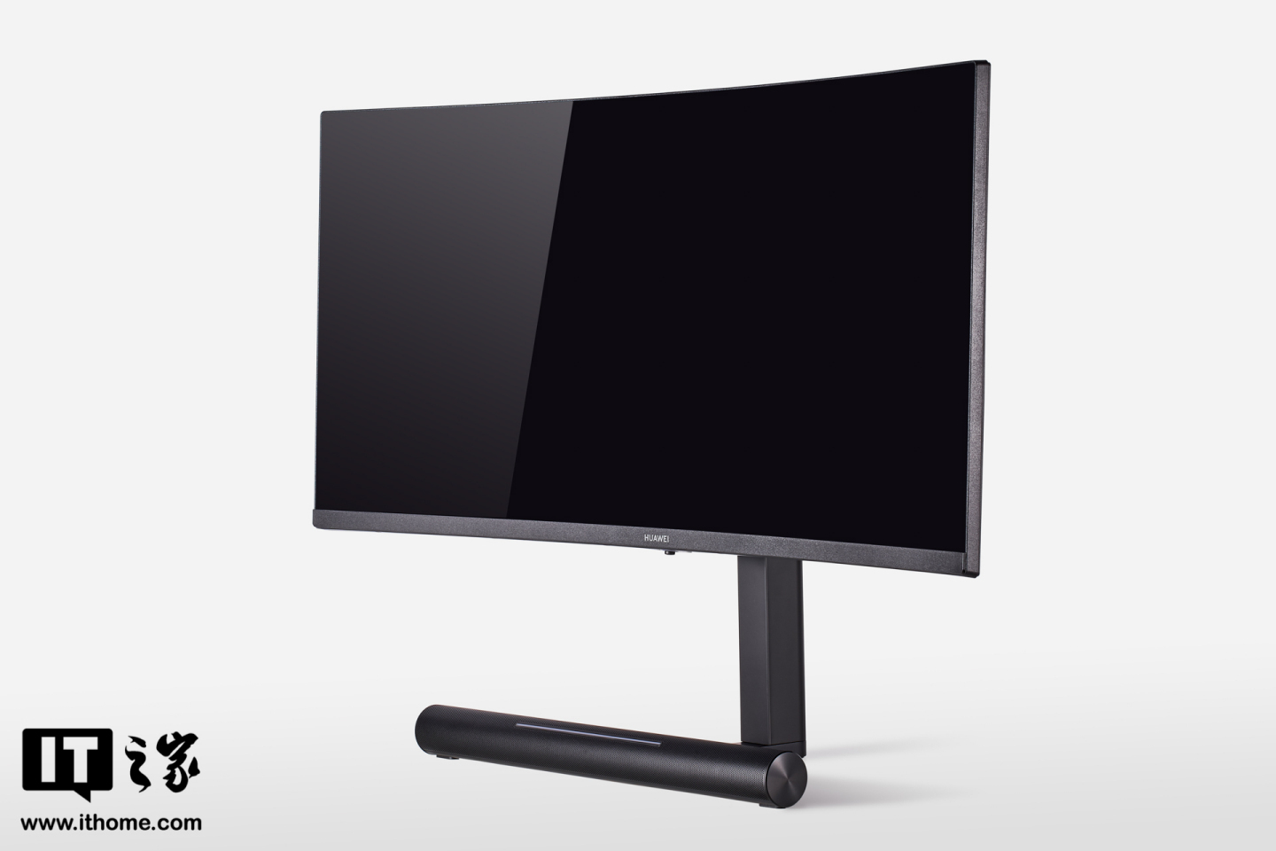 在细节设计方面,华为 MateView GT 首创了一体式 SoundBar 底座,SoundBar 底座内置了两个全频喇叭单元,支持 2.0 声道,拥有 34 CC 大音腔设计,实现澎湃的环绕式立体音效。