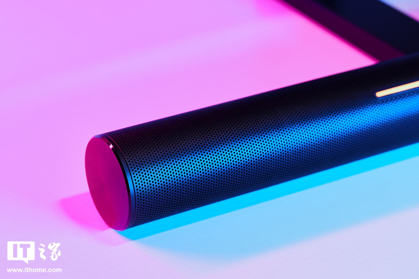 SoundBar 底座还增加了一条炫彩的 RGB 灯光区域,拥有八种酷炫灯效,并且还支持触控式音量调节功能,单指即可调节音量,光随指动。