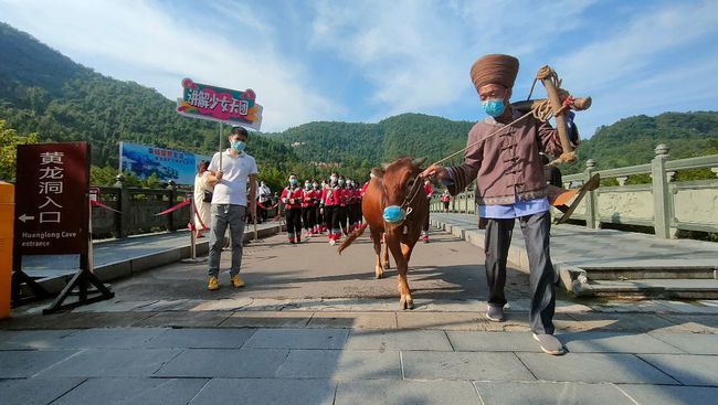 “黄龙精神,再创辉煌!”当天上午九点,黄龙洞生态广场入口处升起一道高达5米的水门,祥源黄龙洞公司员工按照岗位排成整齐的七个方队依次从水门下通过,黄龙洞景区开园仪式在响亮的口号声中拉开帷幕。